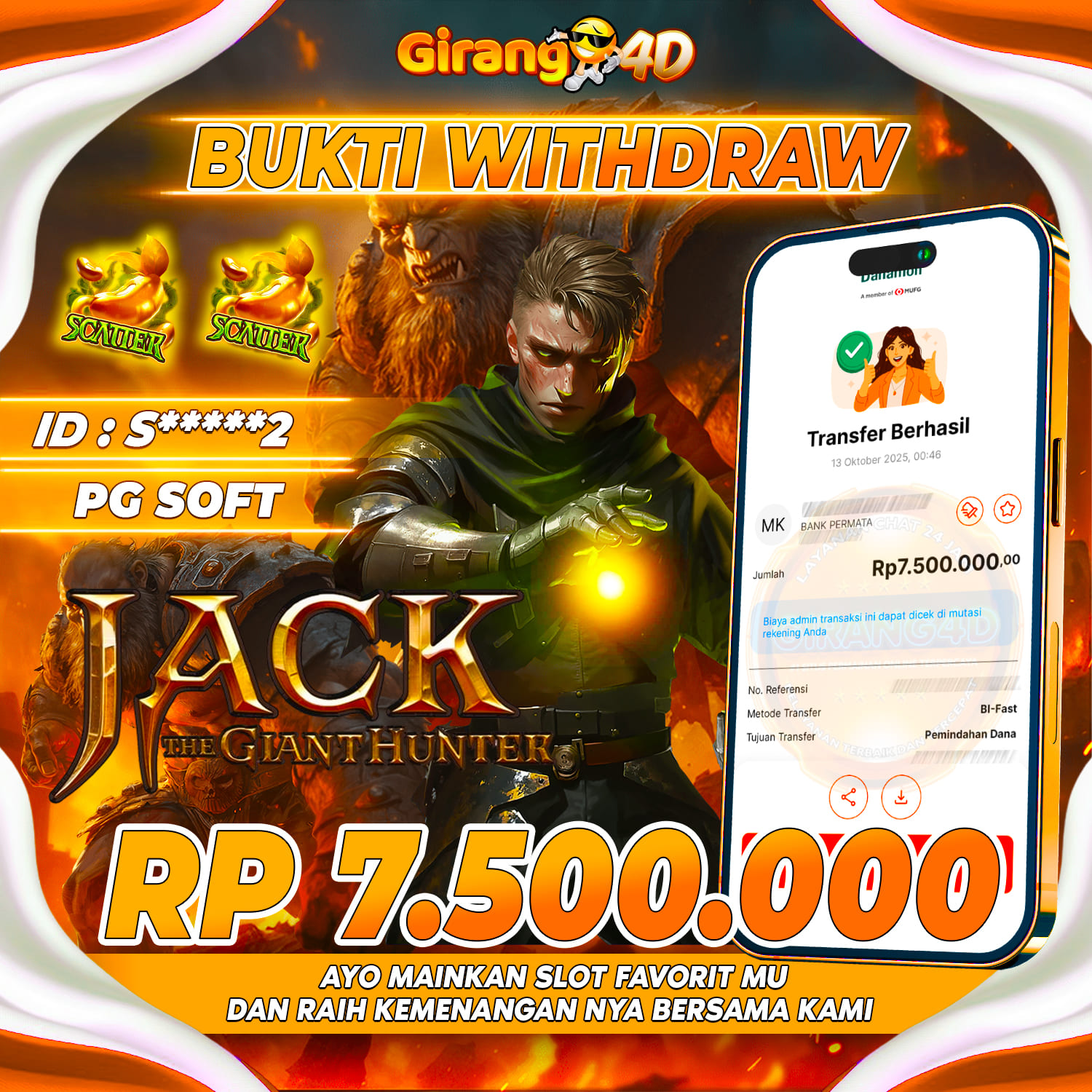 Selamat Kepada Id : S******2 Atas Withdraw Rp. 7.500.000 Juta Hari ini. Ditunggu Withdraw Selanjutnya dan ajak juga teman temannya bergabung di GIRANG4D