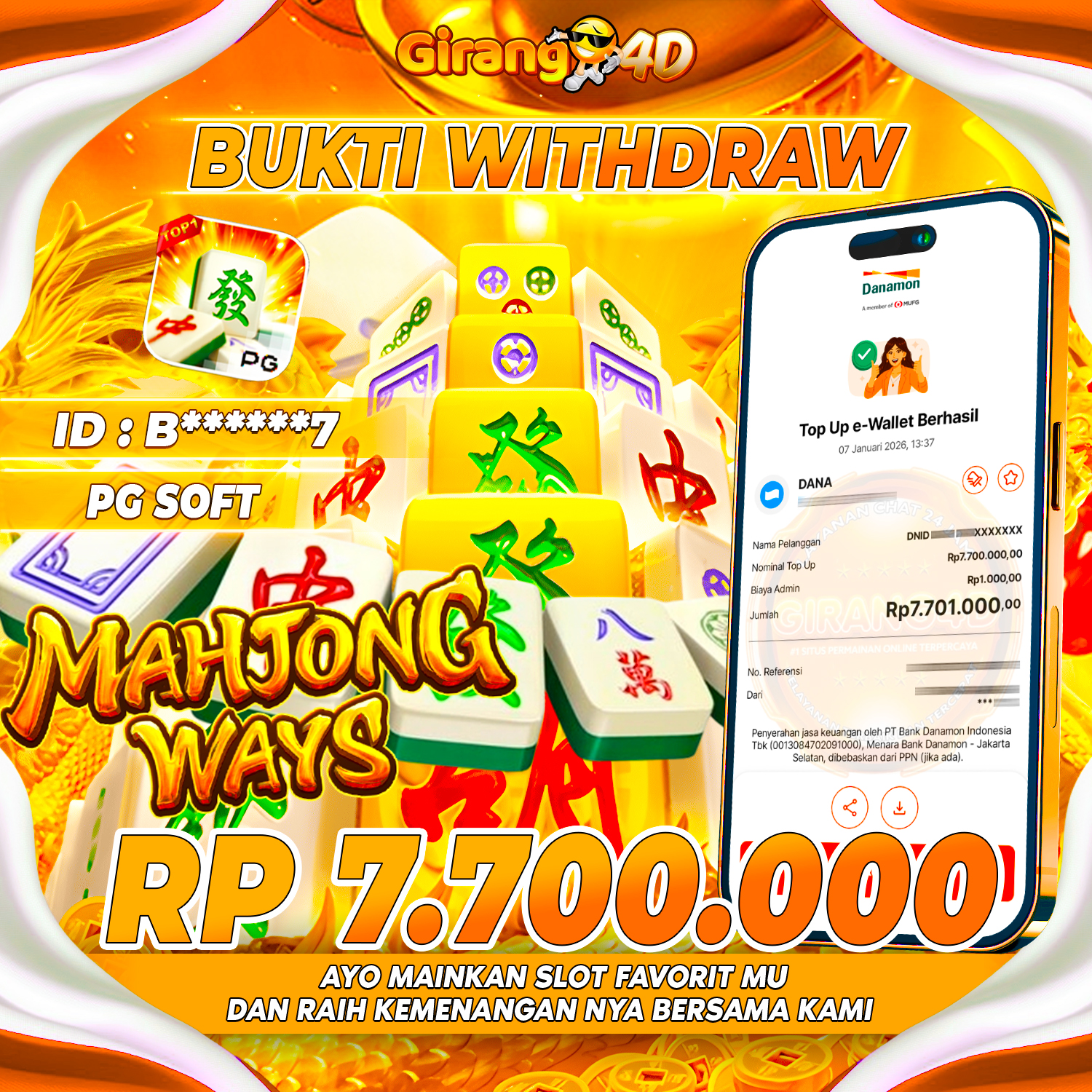 Selamat Kepada Id : B******7 Atas Withdraw Rp. 7.700.000Juta Hari ini. Ditunggu Withdraw Selanjutnya dan ajak juga teman temannya bergabung di GIRANG4D