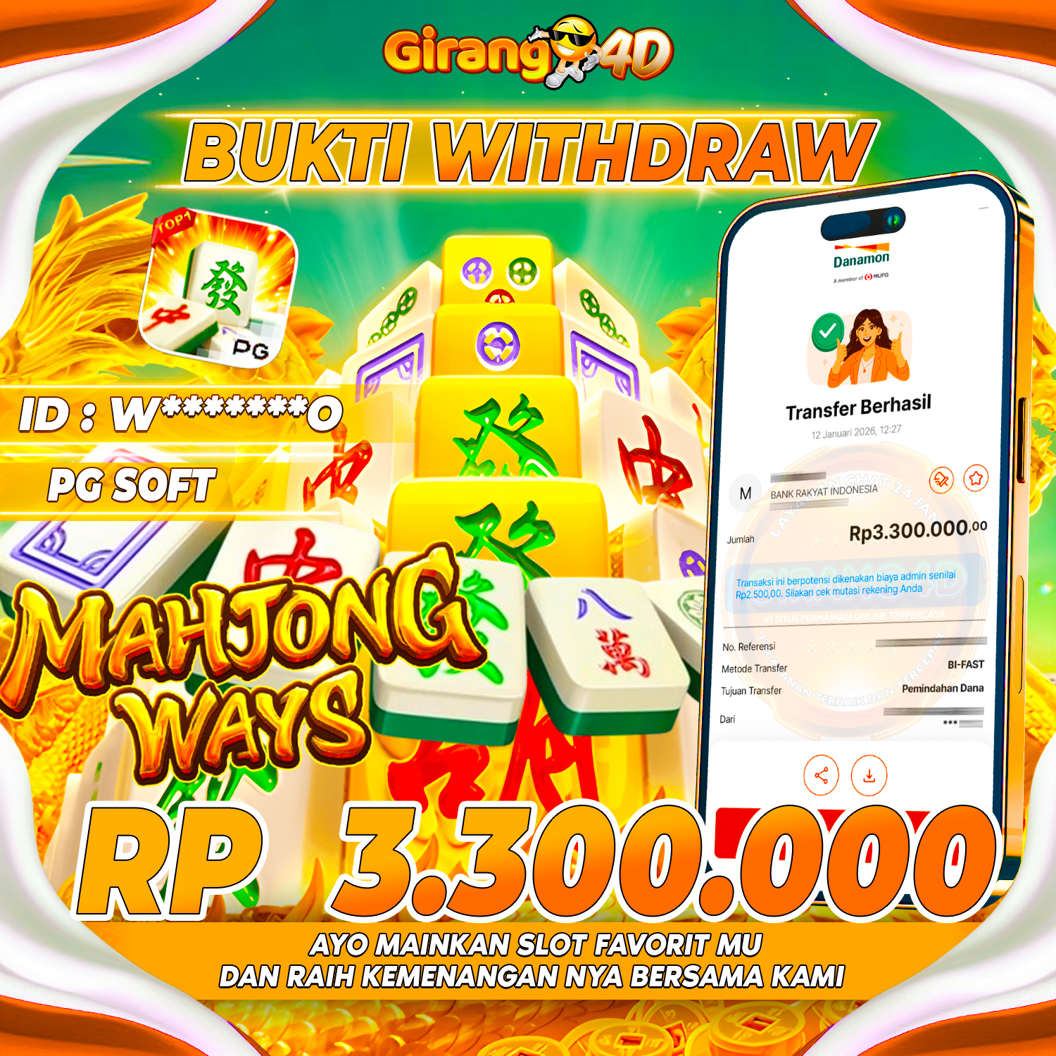 Selamat Kepada Id : W****O Atas Withdraw Rp. 3.300.000 Hari ini. Ditunggu Withdraw Selanjutnya dan ajak juga teman temannya bergabung di GIRANG4D