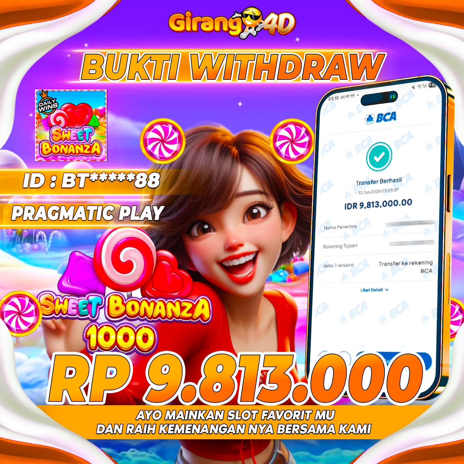 Selamat Kepada Id : BT*****88 Atas Withdraw Rp. 9,813,000 Juta Hari ini. Ditunggu Withdraw Selanjutnya dan ajak juga teman temannya bergabung di GIRANG4D