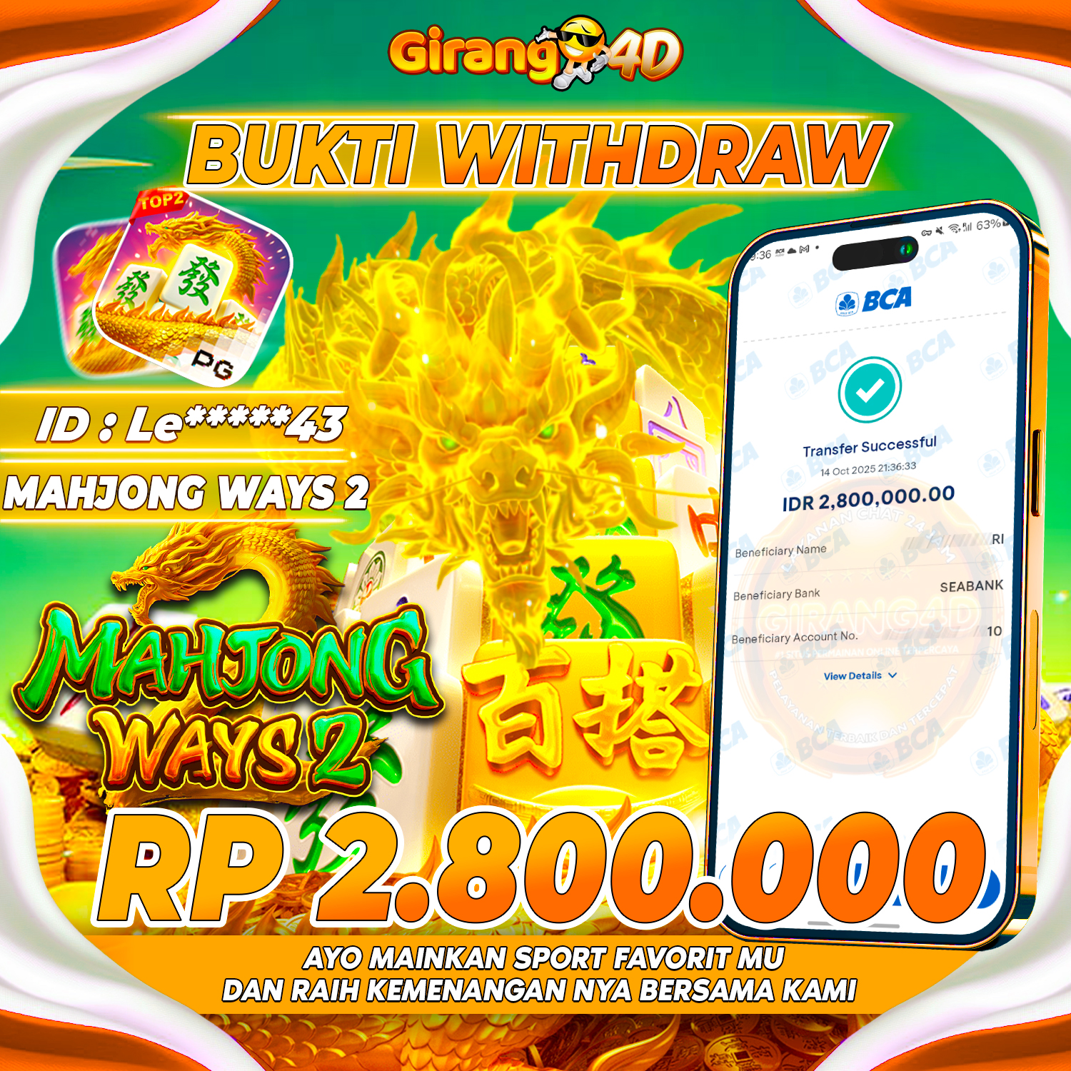 Selamat Kepada Id : Le****43 Atas Withdraw Rp. 2.800.000 Juta Hari ini. Ditunggu Withdraw Selanjutnya dan ajak juga teman temannya bergabung di GIRANG4D
