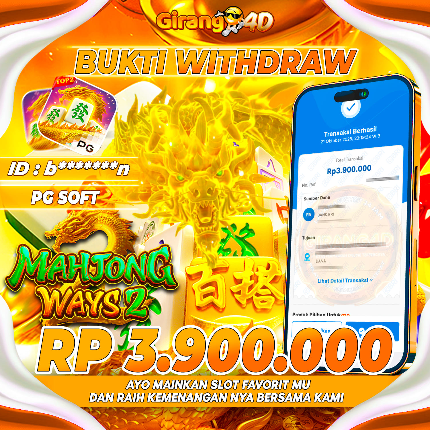 Selamat Kepada Id : B******n Atas Withdraw Rp. 3.900.000 Juta Hari ini. Ditunggu Withdraw Selanjutnya dan ajak juga teman temannya bergabung di GIRANG4D
