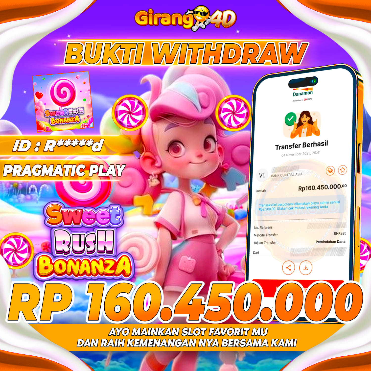 Selamat Kepada Id : R*******d Atas Withdraw Rp. 160.450.000 Juta Hari ini. Ditunggu Withdraw Selanjutnya dan ajak juga teman temannya bergabung di GIRANG4D